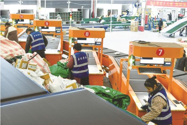 近日,海安郵政轉(zhuǎn)運(yùn)中心內(nèi),快遞分揀員正在分揀快遞,保證節(jié)前準(zhǔn)確送達(dá)。春節(jié)前快遞運(yùn)輸迎來高峰,該中心當(dāng)天處理量高達(dá)12萬件,比平時增加近35%。