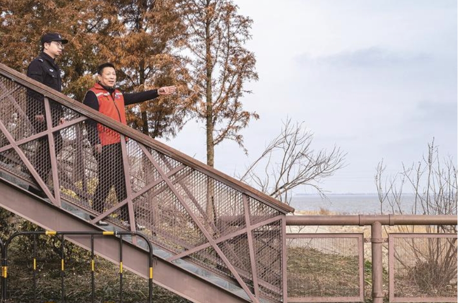 一江碧水,浩浩東流。24日下午1時許,穿上紅色志愿者馬甲的邢衛(wèi)全和新警許俊軍頂著寒風,在海門青龍港寬闊的江堤上行走。