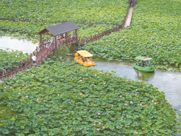19日,游客在如皋市平園池村千畝藕池文化園賞荷游覽。近年來,平園池村積極打造荷藕產(chǎn)業(yè)鏈條和荷鄉(xiāng)旅游品牌,獲評(píng)中國(guó)美麗休閑鄉(xiāng)村、全國(guó)鄉(xiāng)村治理示范村、全國(guó)文明村等。 記者 許叢軍攝
