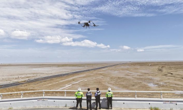 14日,民警、輔警操控無人機在沿海灘涂巡防。連日來,海安市公安局濱海新區(qū)派出所加強沿海區(qū)域巡邏防控,開展應急救援演練,宣傳灘涂安全常識,及時勸阻私自下海人員,消除安全隱患,守護群眾安全。 周強攝