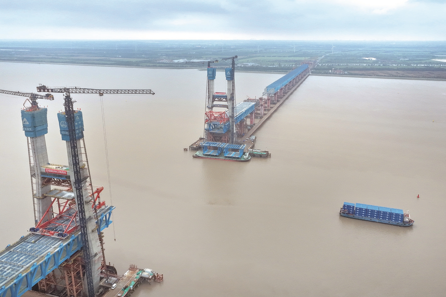 昨天,目前在建的世界最大跨度公鐵兩用無(wú)砟軌道斜拉橋——崇啟公鐵長(zhǎng)江大橋雙主塔同日封頂,大橋由此轉(zhuǎn)入斜拉索掛索施工新階段。 記者許叢軍
