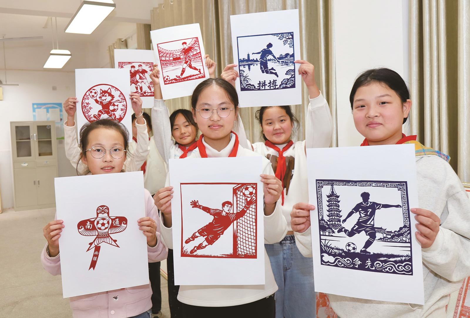 “蘇超”決賽開賽在即,29日,如皋市長江鎮(zhèn)車馬湖小學(xué)“巧手慧心”剪紙社的同學(xué)們在南通非遺剪紙傳承人李海烽的指導(dǎo)下,以“蘇超”南通隊為主題,設(shè)計創(chuàng)作出一批剪紙作品,用自己的方式為南通隊助威。記者黃哲