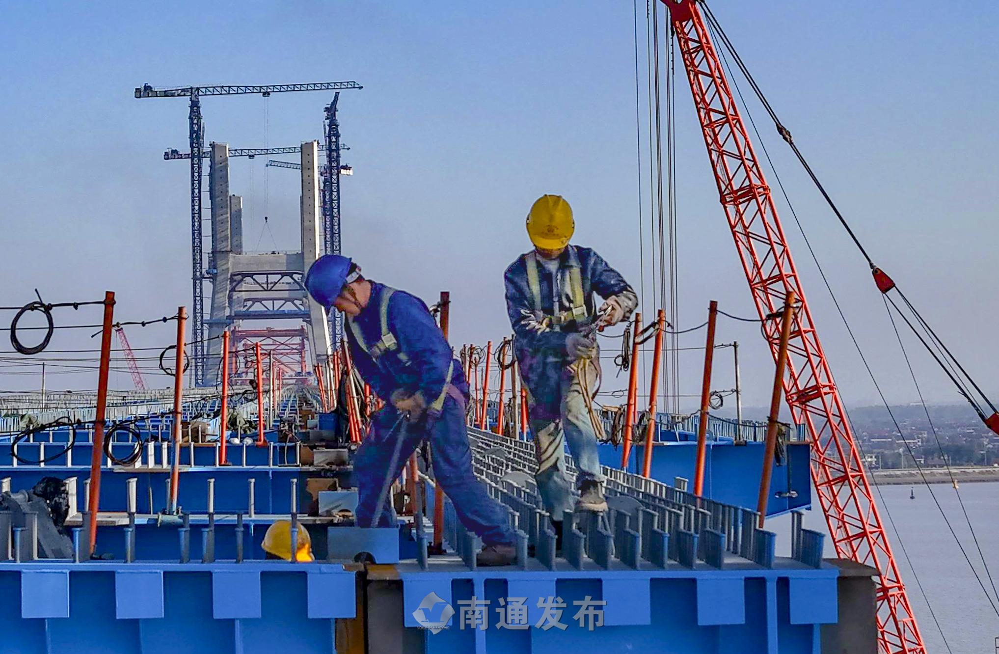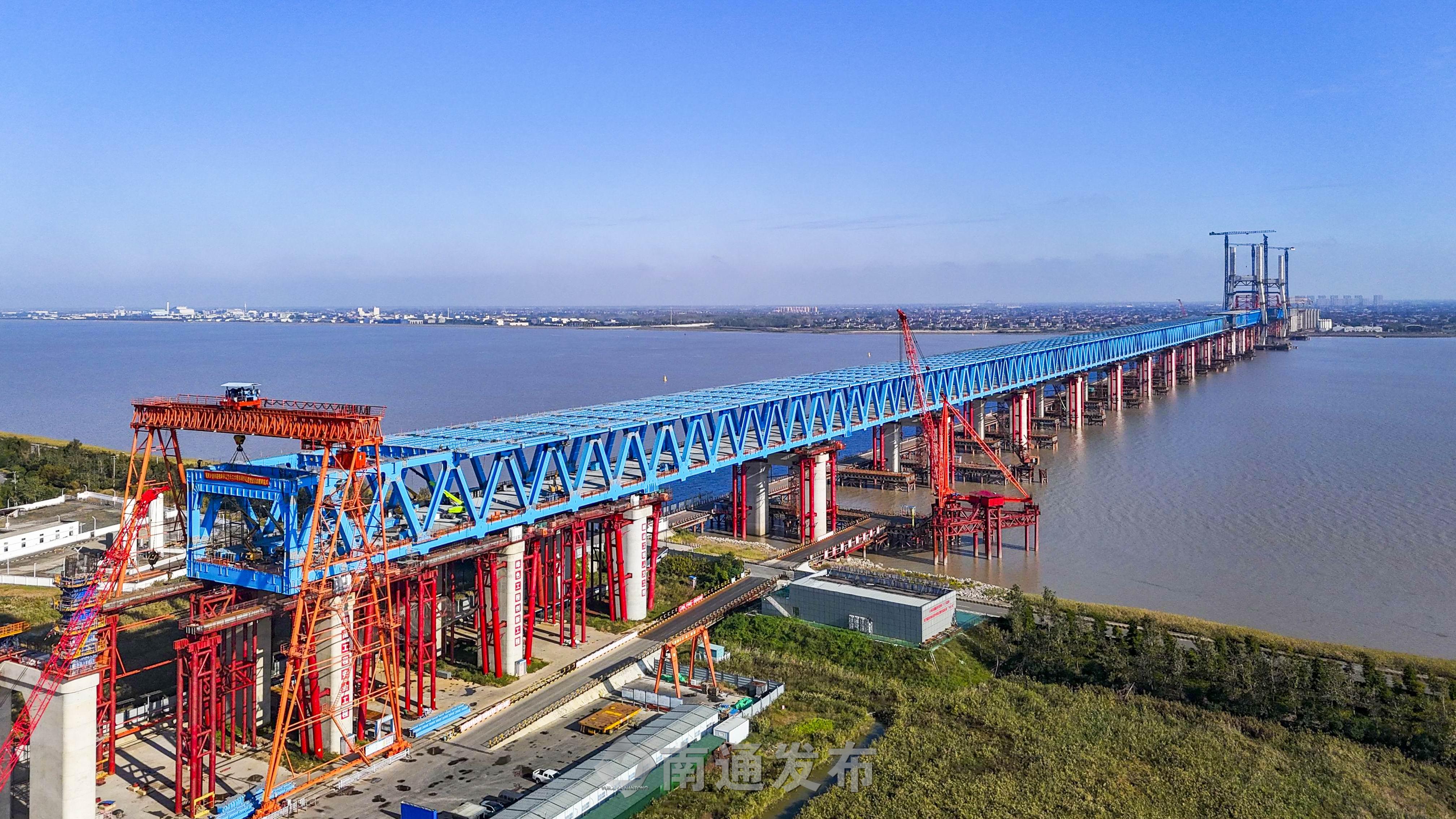 現(xiàn)場(chǎng)負(fù)責(zé)人張曉波介紹,此次吊裝組拼完成的是非通航孔最后一根公路橫梁。鋼桁梁由工廠制造,水路運(yùn)輸至橋位處碼頭,去年6月6日開(kāi)始在大橋南岸鋼梁預(yù)拼場(chǎng)吊裝組拼。非通航孔橋鋼梁公路橫梁吊裝組拼全部完成為最后一輪頂推和后續(xù)與主通航孔鋼梁“會(huì)合”以及公路橋面板安裝等施工創(chuàng)造了有利條件。